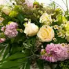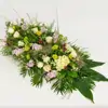 Ramo funerario con flores en tonos pastel Ramo funerario de aire romántico con flores en tonos pastel y verdes esponjosos