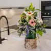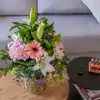 Celebra la serenidad y el amor  con este jarrón cilíndrico lleno de flores suaves y delicadas, creando un ambiente tranquilo y reconfortante para celebrar en su día especial.