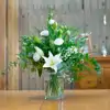 ¡Dulce y natural! Perfecto para regalar o iluminar cualquier estancia, un hermoso ramo en blancos y foliage de temporada con jarrón incluido. Si quieres ir sobre seguro, el blanco nunca falla. Regala este ramo lleno de luz y serenidad, con elegantes liliums casablanca y lisiantum blancos, y toques románticos con paniculata blanca. Un diseño puro y espectacular.