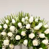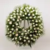 Preciosa corona compuesta por rosas cerradas de color blanco. Disponible en medida pequeña y grande