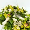 Bonita corona funeraria con rosas, orquídeas , lisianthum, safari y variedad verdes decorativos