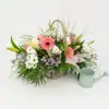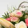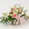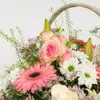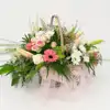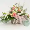 Composición con flor variada en tonos suaves, la base puede ser distinta a una cesta. Cesta de mimbre con flores de distintas variedades, de aire esponjoso, en tonalidades suaves que dan un toque de calidez y romanticismo. Un regalo elegante, amoroso y lleno de dulzura