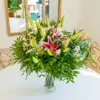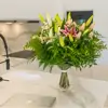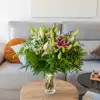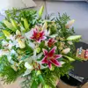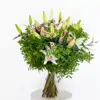 Descubre la elegancia de nuestro ramo de lilium en su máxima expresión compuesto por 9 cautivadores liliums, 1 pomo de matricaria y verdes decorativos, este ramo es una armoniosa combinación que rememora momentos mágicos.Cada lilium aporta gracia y serenidad, mientras que la encantadora matricaria y la perfecta combinación de verdes decorativos crean una armonía visual única. Ideal para celebrar momentos especiales o transmitir luz y vitalidad a tu precioso hogar.Inspira tus emociones con la frescura de las flores de temporada, ¡la magia está garantizada!