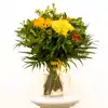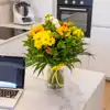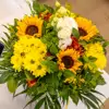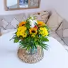 Slunce resplandece por si solo gracias a la presencia de las margaritas, los girasoles y los lisianthums en tonos amarillos .Jarrón NO incluido