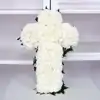Cruz funeraria elaborada con claveles color blanco, muy elegante. Disponible en varias medidas: 50cm, 70 cm y 1 metro