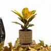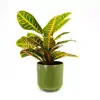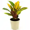 Planta de interior que posee la mayor gama de colores vivos en sus hojas. Sus hojas son duras y con nervaduras que van desde el amarillo hasta el rojizo. (Tiesto no incluido) Dentro de los Crotons existen muchas variedades de diferntes formas y colores en sus hojas. Puede alcanzar los 90 cm de alto. Los colores verdes, amarillos, naranjas y rojos se combinan en sus hojas. Si observamos que es originaria de las islas del Pacífico, marca mucho los cuidados de estas planta: la demanda de humedad.